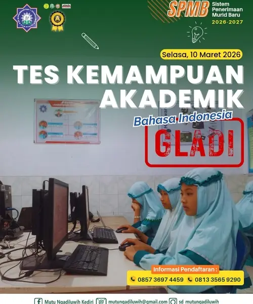 Selasa, 10 Maret 2026, siswa-siswi kelas VI di SD Muhammadiyah 1 Ngadiluwih melaksanakan gladi bersih Tes Kemampuan Akademik (TKA) Bahasa Indonesia sebagai bagian dari persiapan menghadapi pelaksanaan tes yang sesungguhnya. Kegiatan ini dilaksanakan di laboratorium komputer sekolah dengan suasana yang tertib dan penuh semangat.